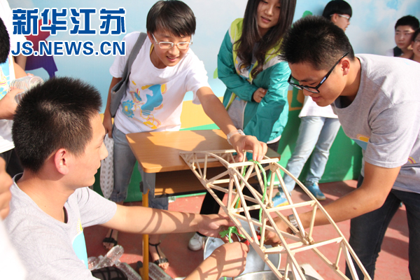 在模型搭建环节,营员们亲自动手加工木材、设计模型,再把一个个小木板粘合在一起,把设计变成了他们手中的模型。孩子们一边展示自己的成果,一边与大家分享自己的创造过程。在检测了孩子们的模型作品后,东南大学指导老师李昕说:“这些孩子做得非常棒,想象力非常丰富,他们利用三角形和弧形的稳固性,在模型加载评分测试中超出了我制定的标准。此外,他们的手工也做得非常精细,这些表现都出乎了我的意料。”模型搭建冠军组的组长王雨祥兴奋地对记者说:“我们非常喜欢科学知识,对这些未知神秘的创意充满好奇。我们也曾参加过比赛,做过‘隐形鼠标手’、‘机器人’等小作品,希望通过这次锻炼能学到更多有用的知识,满足我们求知的心愿。”参与比赛的孩子们还将夏令营的口号选定为“把心中的梦追到底!”