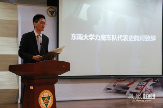 队长史昀珂代表车队发表致辞,介绍车队从建立初期到现在的心酸历程。“来到东南大学,我感受到了东大赛车队成员对赛车的热爱,更有学校为其提供的种种支持,所以,力魔集团才对东大车队情有独钟,并愿意支持车队的工作,希望未来的汽车工程师们与力魔一起推广赛车运动,传承赛车精神。”德国力魔驻中国办事处经理Robert Niegel表示。