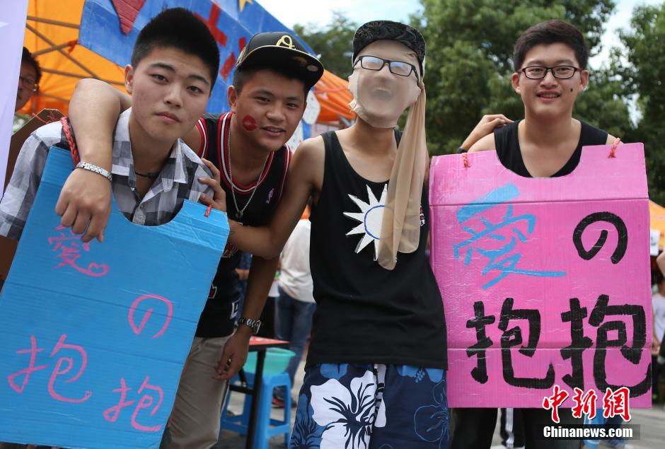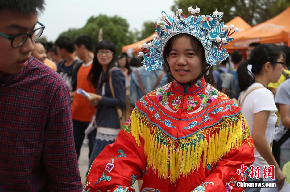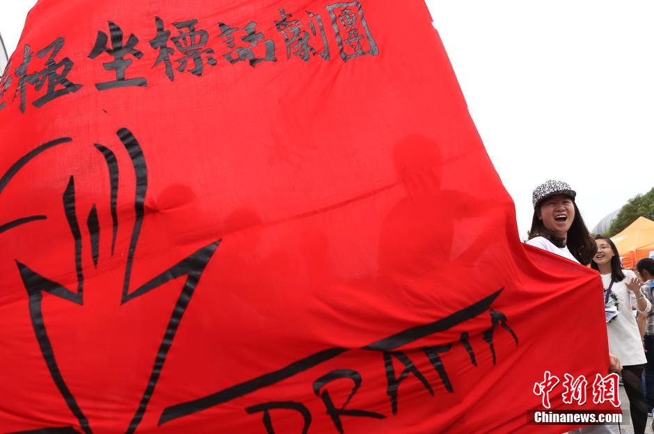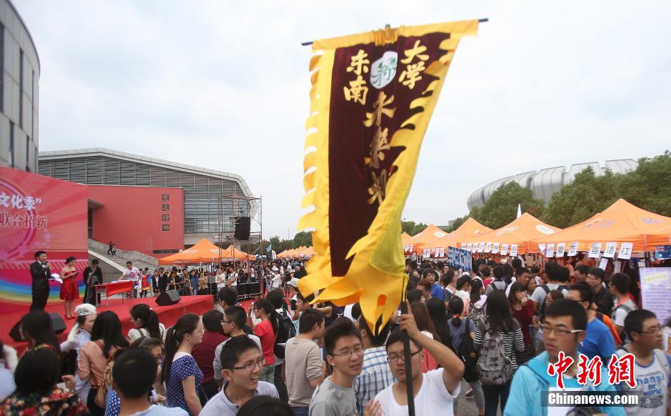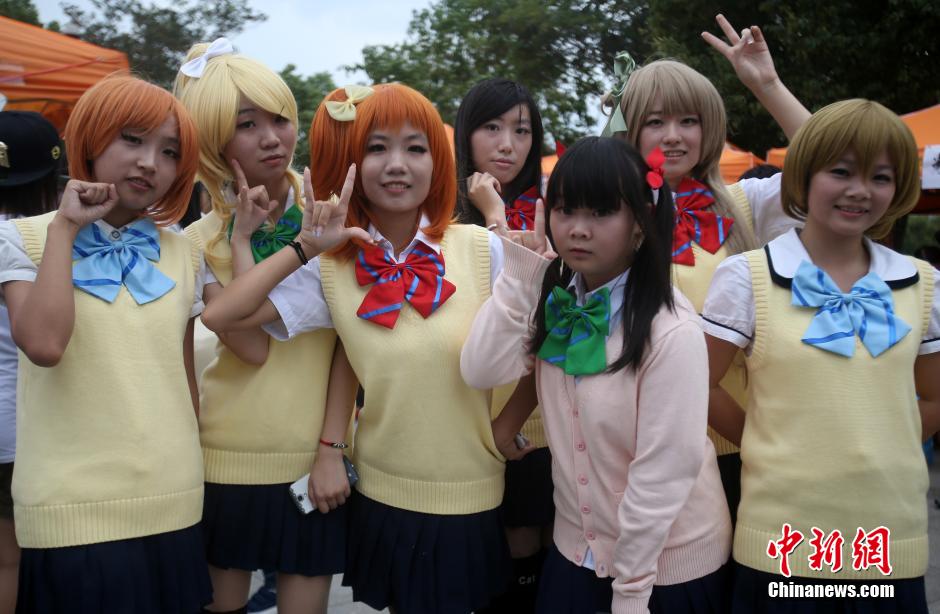 9月22日,一年一度的南京东南大学新生文化季“百团大战”在该校九龙湖校区拉开大幕,科技、文化、体育、艺术等五大类,一百多个学生社团摆开阵势摇旗呐喊,纷纷以自己的特色在现场吹拉弹唱、卖力吆喝,以此来吸引新生加入,热闹不已的场景形成了一道独特的人文景观。图为动漫社的成员合影。 中新社发 泱波 摄