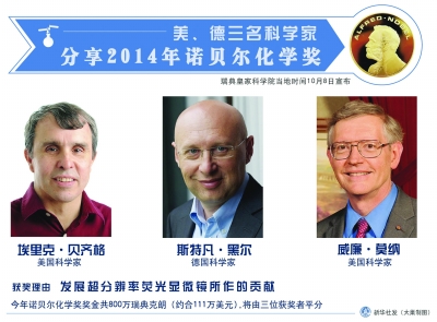 美国科学家埃里克·贝齐格、威廉·莫纳和德国科学家斯特凡·黑尔因开发出超分辨率荧光显微镜而获得2014年度诺贝尔化学奖。