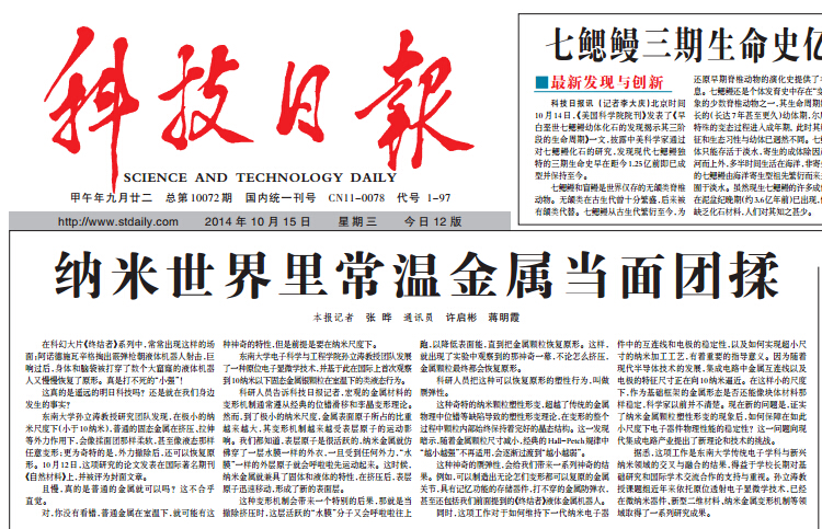 东南大学孙立涛教授研究团队发现,在极小的纳米尺度下(小于10纳米),普通的固态金属在挤压、拉伸等外力作用下,会像揉面团那样柔软,甚至像液态那样任意变形;更为奇特的是,外力撤除后,还可以恢复原形。10月12日,这项研究的论文发表在国际著名期刊《自然材料》上,并被评为封面文章。
