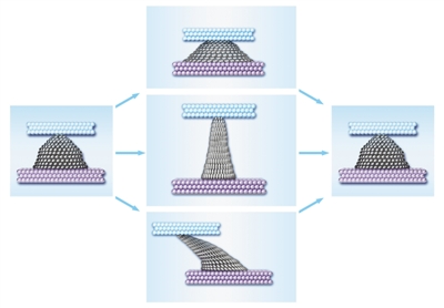 “经典金属变形理论基于位错滑移理论,即固体金属的原子有规律地排列成类似阅兵的方阵,遇外力时原子层与原子层之间互相滑动,在无外力干预情况下不可恢复原状。”孙俊向记者解释,但到了极小的纳米尺度,金属表面原子所占比重越来越大,其变形机制,也越来越受表层原子的运动影响。由于表层原子非常活跃,纳米金属就仿佛穿了一层“水膜”一样的外衣,一旦受到外力,“水膜”一样的外层原子就会先运动起来,这时的纳米金属就兼具了固体和液体的特性。纳米金属在挤压后,表层原子迅速移动,形成了新的表面层,而撤除挤压时,这层活跃的“水膜”分子又会呼啦啦往上跑,直到把金属颗粒恢复原形。