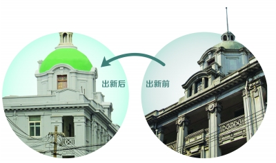 左图:修缮过的大楼顶部刷成了绿色。 王宁 摄