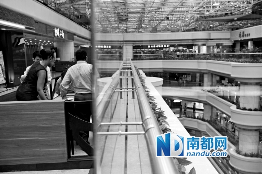 昨日下午,天河城7楼的中庭附近,原有的高约1.1米的护栏内,又加装了一块高约为1.7米的玻璃。在天河城6楼的宴江南、大家乐附近,也新增了高约1.35米的木质扶手护栏。有保安表示,此举是为了防止人员坠楼。