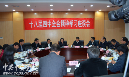 郭广银指出,党的十八届四中全会围绕建设中国特色社会主义法治体系做了全面系统的阐释和部署,全会审议通过的《决定》是新形势下全面推进依法治国、加快建设社会主义法治国家的纲领性文件。当前,“中特”中心的首要任务就是要着力研究阐释十八届四中全会的精神,结合江苏的贯彻落实情况,推出有说服力、影响力和创新度的研究成果。江苏省人大法制委员会副主任王腊生、江苏省政府法制办副主任马太建、江苏省委党校副校长桑学成、江苏省社科院副院长刘旺洪、东南大学马克思主义学院常务副院长袁久红,苏州大学公共管理学院教授方世南等专家学者从科学立良法、坚持依法行政、正确理解党的领导和依法治国的关系、贯彻落实四中全会精神需要正确处理好几对关系、依法治国与社会主义核心价值观建设以及基层治理法治化等角度先后进行了交流发言。省社科联党组书记刘德海强调,社科工作者要有责任担当,研究问题要有宏观视野,要依靠辩证思维加强对中国特色社会主义理论的历史纵深研究。省委宣传部部务委员双传学主持了学习交流。