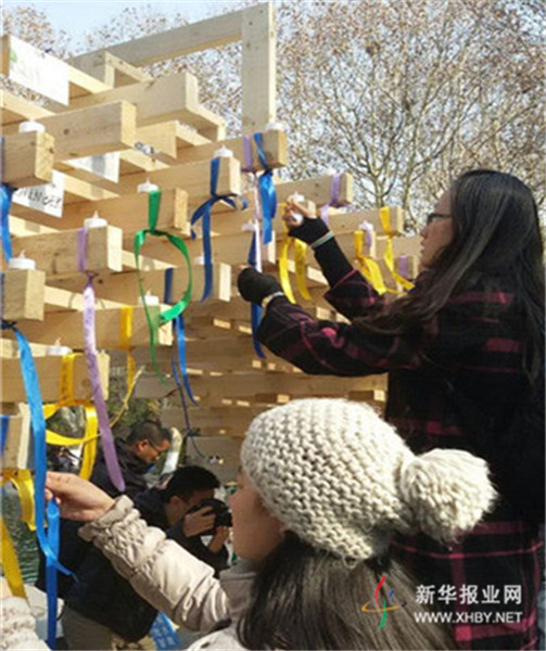 在昨天的纪念活动现场,由东大建筑学院老师指导设计、同学们亲手搭建的高近2.6米、宽5.4米、长3.6米的“覆兴坛”显得格外醒目。该坛由320多块木条构成,从顶部和侧面看呈十字结构,其思路源于齐康院士设计的南京大屠杀遇难同胞纪念馆一期建筑中的十字碑,彰显庄重与肃穆;从正面看,“覆兴坛”造型呈坛状,仿佛是一双呵护着梦想与希望的温暖手掌,既可在出挑处放置师生们准备好的电子蜡烛,也可以扎系师生们写满祈福与祝愿的五彩丝带。“这样新颖而富有深意的设计恰到好处地表达了东大师生对南京大屠杀死难者的纪念和哀悼,体现了中华民族众志成城、同心协力的爱国情怀。”东大党委副书记、副校长刘波说。在简单而隆重的纪念仪式之后,师生们纷纷在五彩丝带上写下各自希冀和祝福和平的心语,系在“覆兴坛”上,并在坛梁上放置电子蜡烛,以表哀思与祈福。据悉,电子蜡烛将持续点燃至14日。