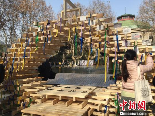 此次设计的这个覆兴坛,高近2.6米,宽度5.4米,长度3.6米,由320多块木板组成,全木质结构。据介绍,这是由东南大学建筑学院韩晓峰老师指导设计,经由同学们亲手搭建在底层设计采用中国传统木工挖槽榫卯的设计方式,设计出为榫卯卡接的十字平面;在上层搭建中采取横竖交织的搭建方式,为木料横纵搭接形成的可供人站立的门拱。