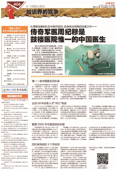 周纪穆是侵华日军南京大屠杀期间,鼓楼医院唯一一名在此工作的中国医生,他从1937年12月12日晚来到南京鼓楼医院,协助五名外籍医生救治难民和伤员,一共144天。