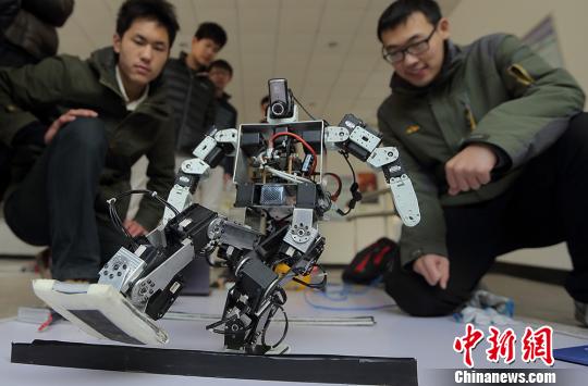 大学生展示“具有越障功能的人形机器人”,该机器人能识别道路信息,实现双足行走及跨越障碍。 泱波 摄