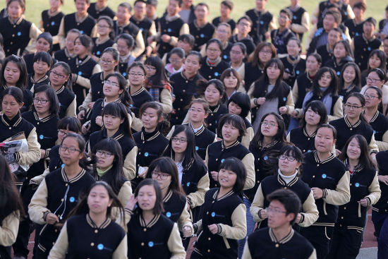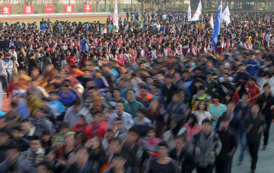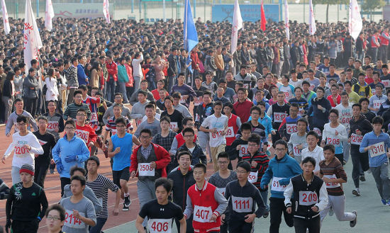 12月27日,参加万人健身长跑的大学生们整齐出发。当日,南京东南大学迎新年万人健身长跑比赛活动在该校九龙湖校区内举行,来自各院系的万余名大学生们在“我运动、我健康、我快乐”的呐喊声中,用低碳、健康、快乐的方式迎接2015新年的到来。