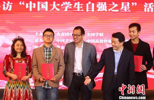 嘉宾(中、右二)为获得“中国大学生自强之星标兵”称号的获奖大学生颁奖。泱波 摄
