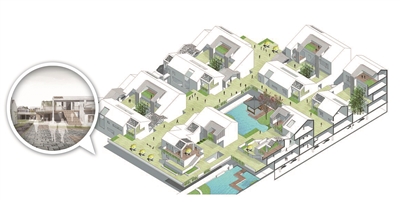 在处理“旧与新”建筑时,郑炘教授引入“空中庭院”的概念。“中国传统建筑的庭院一般是在地面上的,新建区域的建筑将二楼设计为庭院。建筑主要为三层小楼,一层为参观展示区,二层设计成无顶的平台,种上植物后设计成庭院休闲区,三楼为私人休息区。”