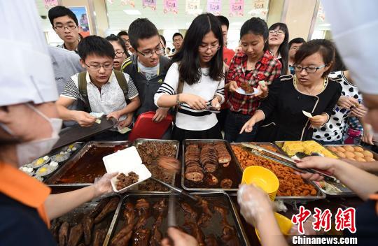 5月8日,由南京多所高校参与的“高校美食联展”暨东南大学第二届美食文化节在东南大学四牌楼校区沙塘园食堂举行,参与高校精心挑选了属于自己学校特色的美食近50个品种供师生挑选,南京农业大学的南农烧鸡、南京航空航天大学的石榴鸡、南京理工大学的荷香南乳鸡等特色美食集中亮相,为大学生们送上色香味俱全的美食盛宴。