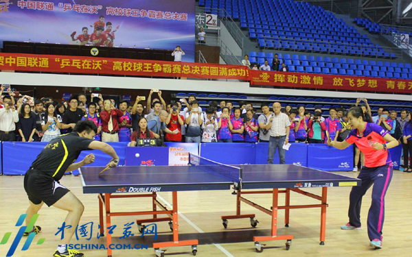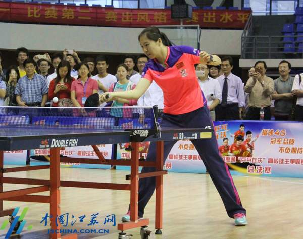 中国江苏网5月16日讯(记者杨丽)今天下午,南京高校球王争霸赛总决赛在东南大学九龙湖校区主体育馆举行,来自南京26所高校近百名选手、16组学校团体参赛。乒乓球奥运冠军李晓霞亲临现场助阵,与东南大学的学生代表、南京各高校教师切磋球技。