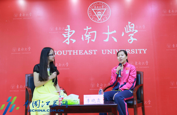 在与师生们切磋完球技之后,李晓霞做客东南大学人文素质大讲堂,与同学们分享了成长中的故事。对于大学生活,李晓霞遗憾地说,自己没有机会在适当的年纪经历大学,她十分向往能体验一下和同学们一起上课、打饭的生活。李晓霞表示,能把自己的经历分享给学生,是自己一直想做的事。谈到心爱的乒乓球,她说:“21年来我一直把乒乓球当成我的生命,它已在我的血液里。曾经我也想过放弃,因为有很多挫折,但是能一直坚持下来,还是因为我非常喜欢它”。同时,她也希望大家都能了解国球,多多喜爱它。最后,李晓霞勉励同学们,“不管是什么事业,只要你一直朝着你的梦想,一点一点去坚持,终有回报。”