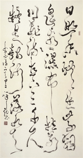 “笔盛力遒开新面”,这是陆俨少先生对闵祥德书法的评论——确实,在业内人士看来,闵祥德书法深得古人之奥。据刘夜锋回忆,闵君自幼酷爱书法艺术,成名较早,先由颜真卿、王羲之入手,兼学怀素及宋四家,上溯至秦篆汉隶,在继承传统基础上另辟蹊径,以奇纵之行草书著称于世,被誉为“书有六朝人风格”。