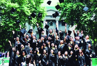 东南大学毕业典礼上,同学们扔帽庆祝毕业。