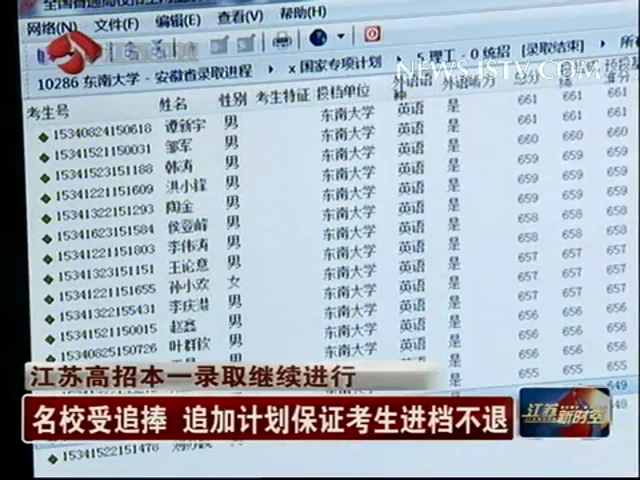 【江苏卫视:江苏新时空】江苏高招本一录取继续进行 名校受追捧 追加计划保证考生进档不退