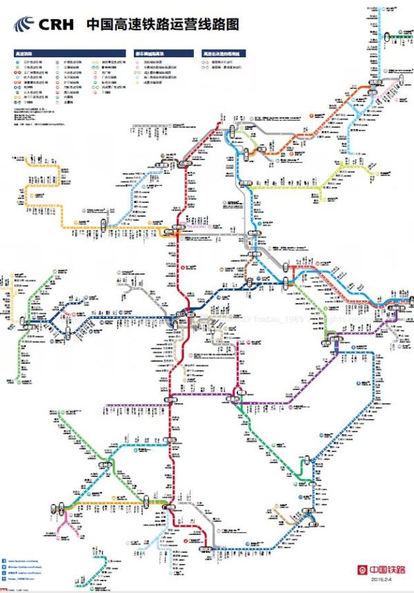 目前,微信上流传的版本是陶岸君2015年2月份创作的最新版全国高铁线路图(中文版),共有大约77条铁路线,分别用32种醒目的颜色来绘制,换乘火车站、线路名称、起始点、停靠站点、站间距等信息都一一标注,非常明晰。其实,在各条线路的颜色选取上陶岸君也是经过慎重考量的。
