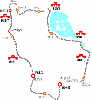 按照规划,南京明城墙分为5段打造:神策门-太平门 ;太平门-东水关 ;东水关-西水关 (秦淮区);西水关-狮子山 ;狮子山-神策门。