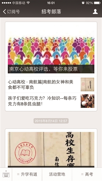 扬子晚报教育微信公众号“招考部落”发起的南京心动高校大比拼在招考部落如火如荼地进行,在鲤鱼姐姐的带领下,高校依次走上台前,充分展现无尽之美!