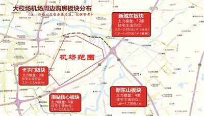 在大校场机场片区尚未改造前,这里的楼市格局又是怎样?按照现有的楼市板块分布来看,距离大校场片区最近的是位于卡子门一带的楼盘,这里与大校场机场的直线距离仅在1千米左右,有保利堂悦和复地宴南都两家楼盘。稍远一点,距离大校场机场2—3千米的区域,就是目前开发热度较高的南站板块,包括万科、证大、绿地、中交等一线房企都已入驻,距离大校场机场5千米的范围内,这里往南是江宁原先的热点岔路口板块以及东山板块,主要有爱涛尚书云邸、远洋绿地云峰公馆、中航樾公馆等纯新盘。往北则能触及到城中东片,往西能延伸到雨花台至安德门一带。往东则涵盖了城东板块的大片区域,如果再扩大到7—8公里,则可以延伸到马群、麒麟一带,包括世茂招商语山、启迪方洲、中海国际社区、中南世纪雅苑等大批在售项目都属其中。如果换一个角度,以机场片区为中心,那么周边的东西南北将依次分布有新城东(光华门至麒麟)、卡子门、南站核心区、江宁岔路口及东山几大楼市板块。周边更是聚集了近20家在售楼盘,形成了包括商务和居住在内的丰富业态。