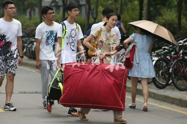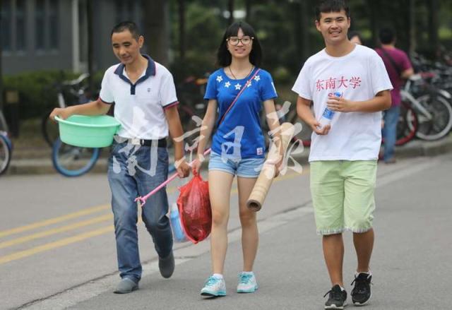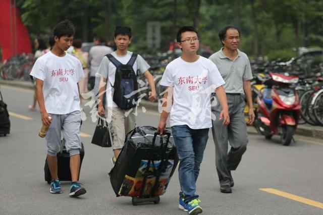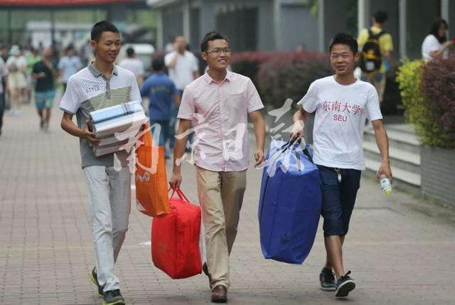 8月29日,东南大学学生志愿者帮助新生搬运行李。当天,东南大学2015级本科新生报到入学,东南大学今年将迎来3986名大一新生。学校安排贫困生通过“绿色通道”直接入学,缓缴学费和住宿费,并向他们现场发放助学金,赠送学习和生活用品。南京日报通讯员 许启彬 记者 徐琦摄