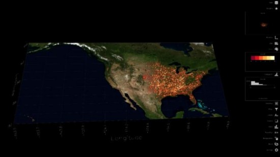 微软在展示大数据可视化系统Surface Hub时,选定对美国过去40年间4万多次龙卷风做了汇总,来显示一段时间内某个地区的龙卷风的频率。
