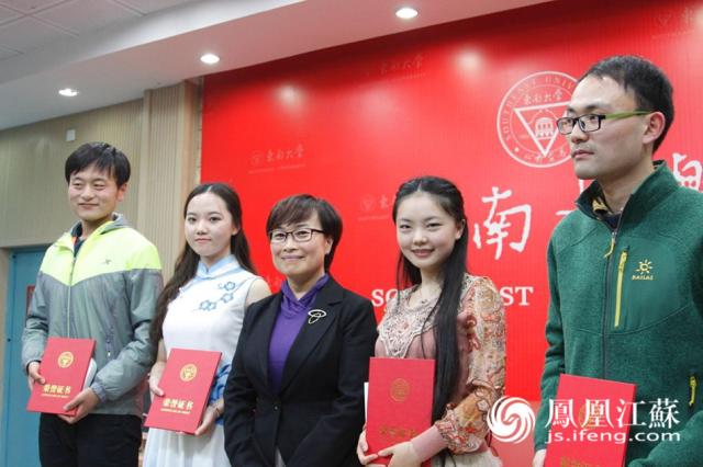 校党委副书记、副校长刘波为四位青春榜样颁奖并合影。