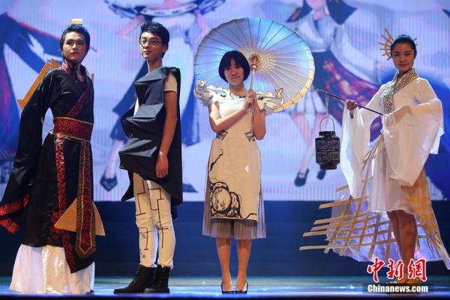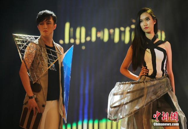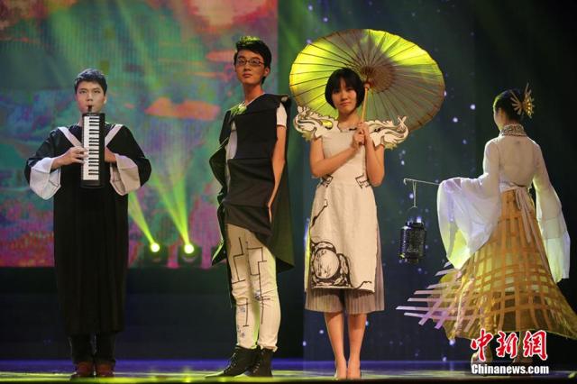 12月17日晚,南京东南大学的大学生在舞台上展示他们根据不同建筑的造型设计制作的“建筑时装秀”。当日,持续三个月的“2015年东南大学新生文化季”在九龙湖校区举行闭幕式暨新生文艺汇演,以“筑梦东南·精彩飞扬”为主题,通过凝聚新生智慧与创意的节目,吸引了众多大学生前来分享充满青春活力、饱含文化气息与人文精神的文化大餐。泱波 摄