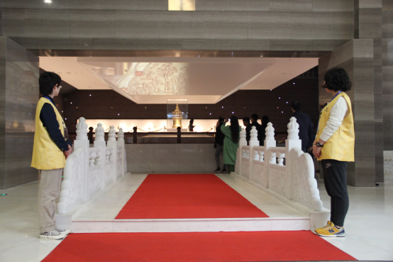 一早,东南大学人文学院10多名同学来到志愿服务点大报恩寺。在负责人的带领下,人文学院学子很快明白了各自的职责,铭记了各注意事项,并迅速到达自己负责的岗位。不一会进口、地宫门口、南朝四百八十寺展厅等地,就分布了穿着黄色马甲的志愿者。一整天志愿者服务之旅就此展开。