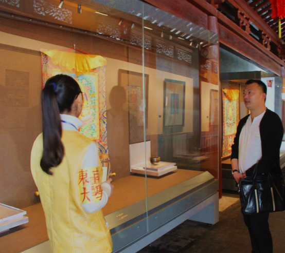 “欢迎来到鎏金七宝阿育王塔!请大家双手合十,保持虔诚和静心,随我进行饶塔仪式。”负责协助讲解的同学一边用右手引导大家进行饶塔仪式,一边给大家讲解阿育王塔的相关知识。有人问:“累吗?”她抿了抿嘴,说:“不累,就是嗓子有点不舒服,不过还好。”送走了一拨游客,又涌进了另一拨,志愿者始终抬头挺胸,耐心地讲解,一遍又一遍,没有丝毫倦色。