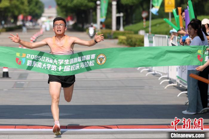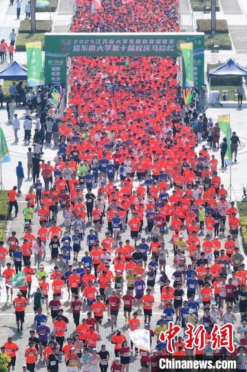 5月17日,2025江苏省大学生路跑联盟联赛暨东南大学第十届校庆马拉松在九龙湖校区火热开跑,4000余名师生、校友及社会跑友齐聚李文正图书馆广场,用坚持和毅力畅跑校园赛道,用激情迎接东南大学123周年华诞。图为师生、校友及社会跑友奔跑在校园内。(无人机照片)中新社记者 泱波 摄