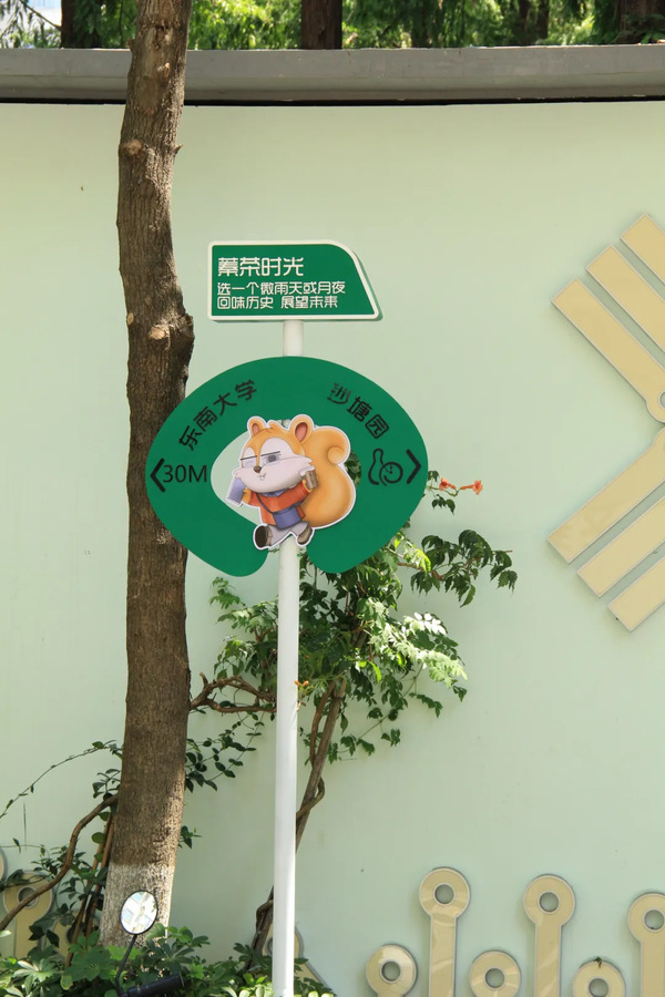 在蓁巷15号楼旁,堆放杂物的空间被设计成休息亭。“过去各种味道,现在坐在这聊聊天,看看街景就非常好。”居民彭阿姨笑着说道。斜对面东大沙塘园宿舍临街围墙,点缀着绿植,配上电子、电源元素的LOGO,形成日夜两种效果,展示了高校学科文化。通往进香河菜场入口处,“消极”的围墙变成了一段遮阳廊道。后期还将增加体现儿童友好的装饰,与一旁的幼儿园呼应。