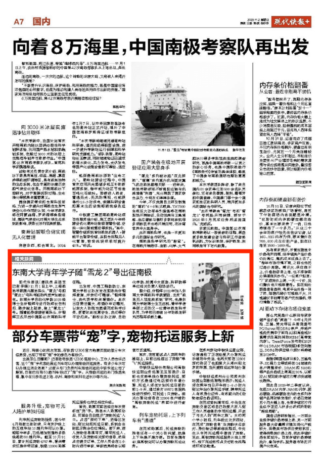 据介绍,许银辉2022年加入东南大学南极科考课题组,主攻“极地无人观监测系统”研究,他是东南大学继博士生王启航、青年学者单硕之后的又一位青年极地科考队员,为学校已持续16年的极地研究历程再添新力量。