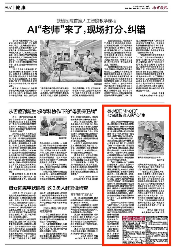 近日,东南大学附属中大医院心脏外科主任曹海龙教授团队与超声医学科、麻醉手术与疼痛管理科、重症医学科等多学科联合,用4厘米的微小切口完成高难度“补心”手术,成功为一位七旬老人修复“漏风”的心脏阀门。