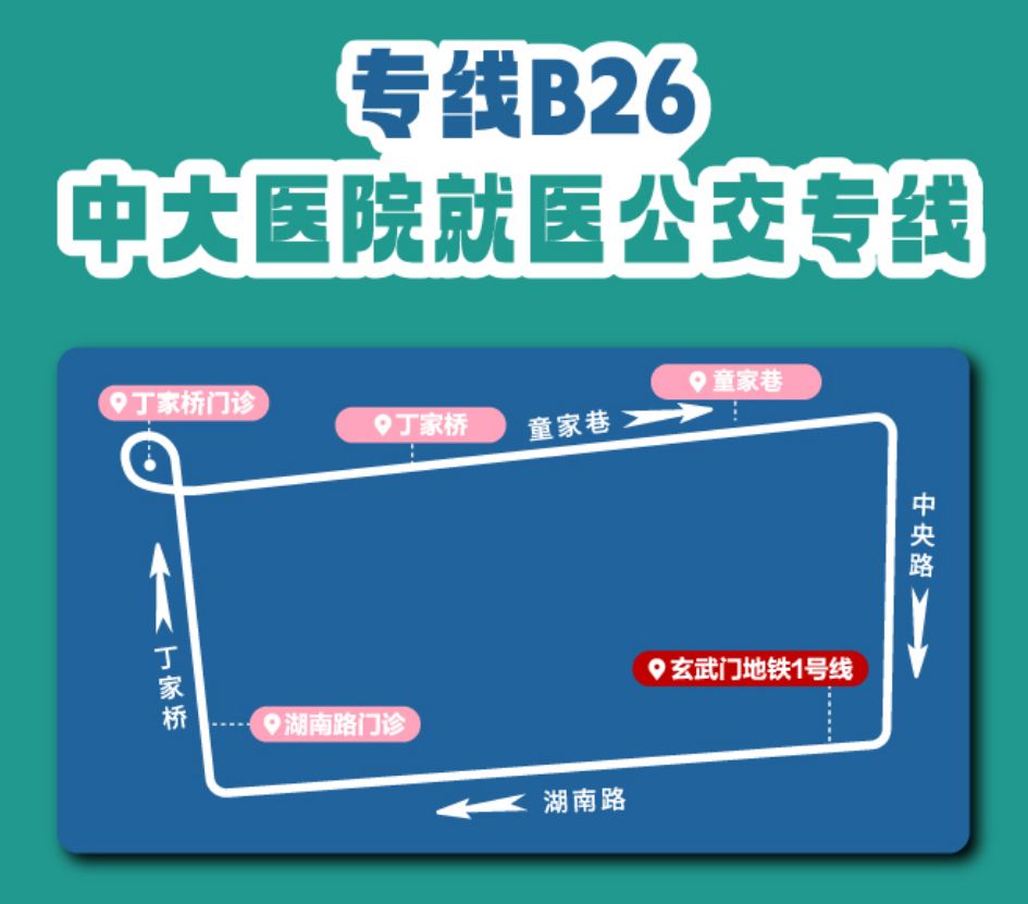 在东南大学附属中大医院建院90周年之际,中大医院推出便民服务新举措:中大医院就医公交B26专线5月17日正式开通。这条专线串联地铁1号线玄武门站与中大医院湖南路门诊、丁家桥门诊两大区域,彻底解决了患者从地铁站到中大医院就医“最后700米”的换乘难题。
