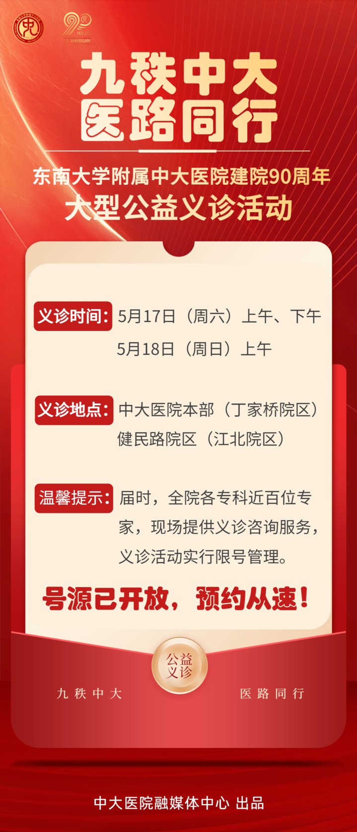 (荔枝新闻讯 通讯员/程倩敏)九秩中大,医路同行。值此东南大学附属中大医院建院90周年之际,为回馈社会各界关心支持,中大医院一院两区将于5月17日(周六)上午、下午及5月18日(周日)上午,在本部(丁家桥院区)与健民路院区(江北院区)同步开展大型公益义诊活动。义诊期间,全院普通门诊与专家门诊免挂号费,以实际行动服务百姓健康。