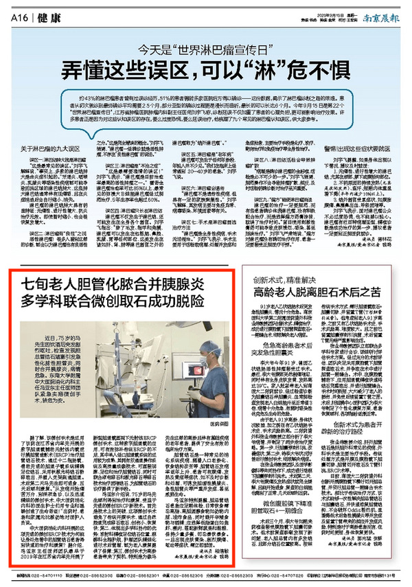 据了解,该微创手术是运用了该院在江苏省内率先开展的数字胆道镜辅助无射线内镜逆行胰胆管造影术(ERCP)治疗胆管结石技术,通过十二指肠镜,借助先进的胆道子镜系统精确定位结石,采用钬激光将结石粉碎取出,并植入支架疏通胆道。术后第二天马先生即可进食,五天后顺利康复。“从发病开始痛苦万分,到深夜急诊,以及迅速精细的微创手术,中大医院消化内科的医生护士们用专业和温暖创造了生命奇迹!”出院时,患者和家属无比激动地对医护人员说。 中大医院消化内科开展的这项先进的微创ERCP技术为何能让身处危情中的胆管结石患者得到快速的治疗和康复?据介绍,冯亚东主任医师团队最早于2019年在江苏省内率先开展了新型胆道镜直视下无射线ERCP微创手术,这种数字胆道镜的应用,可有效弥补传统ERCP的不足,其中单人经口胆道镜系统的运用较为成熟,其拥有双通道操作系统及高质量成像技术,可直接观察、定位和治疗胆管结石,同时可联合液电碎石和激光碎石等碎石技术治疗困难结石,为胆管结石的诊疗提供了新手段。 冯亚东介绍说,75岁的马先生顺利得到治疗和康复,受益于先进的微创ERCP新技术。首先是技术上的突破,这项微创手术避免了传统开腹手术,通过自然腔道完成碎石取石,创伤小、恢复快;第二,体现出多学科协作的优势:放射科精准定位结石位置,麻醉科全程护航,护理团队精细化进行术后管理,都为老人康复提供了保障;第三,微创手术为高龄患者带来了契机,特别是为像马先生这样的高龄且伴有基础疾病的老年患者,提供了安全有效的临床治疗方案。 胆管结石是一种常见的消化系统疾病,随着人口老龄化、饮食结构改变等,胆管结石发病率逐年上升,患者可有腹痛、发热及黄疸等症状,如不及时诊断和处理,可诱发胆源性胰腺炎、急性胆管炎等严重并发症,甚至威胁生命。 冯亚东特别提醒,胆总管结石患者应定期体检,日常饮食需忌高脂、高胆固醇食物如动物内脏、油炸食品,同时避开辛辣食物与酒精;应选择低脂蛋白如鱼虾、瘦肉,搭配新鲜蔬果和粗粮,保持少量多餐,切忌暴饮暴食。一旦出现皮肤黄染、剧烈腹痛、呕吐等症状,需立即就医。 通讯员 程倩敏 南京晨报/爱南京记者 钱鸣 原文网址: http://njcb.xhby.net/pc/layout/202509/15/node_A16.html#content_1485106