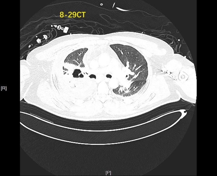 术后一周的CT复查显示,患者胸腔内气胸明显消失,上叶空洞显著缩小,顺利拔除引流管出院。术后一个月再次复查时,胸部CT证实右肺已完全复张,气胸症状彻底消失,达到临床治愈标准。