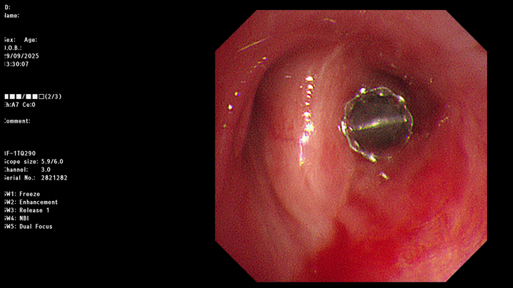 在明确治疗方案并与患者及家属充分沟通后,丁明团队决定实施经支气管镜EBV活瓣封堵术。手术在气管镜引导下进行,根据术前测量的结果,术中仅通过气管镜工作通道便将输送导管准确送到目标支气管,然后推动推送器将一枚直径4毫米的活瓣精准置入右上叶后段支气管开口。