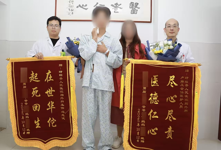 出院当日,小亮家属捧着两面锦旗,紧紧握住医护人员的手激动地说道:“感谢!是你们的不放弃,给了孩子第二次生命!”