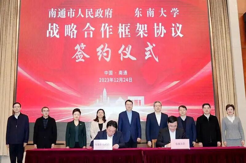 2023年12月24日,东南大学与南通市人民政府签署战略合作框架协议。双方聚焦服务海洋强国战略深化合作,建好海洋高等研究院等合作载体和项目;携手推动办学资质报批、中外合作办学、政策资金争取等重点事项落地;要以高品质校区、高品质师资推动产出高品质成果。期间还实地考察了紫琅科技城、五山及滨江片区、花鸟园片区等处。