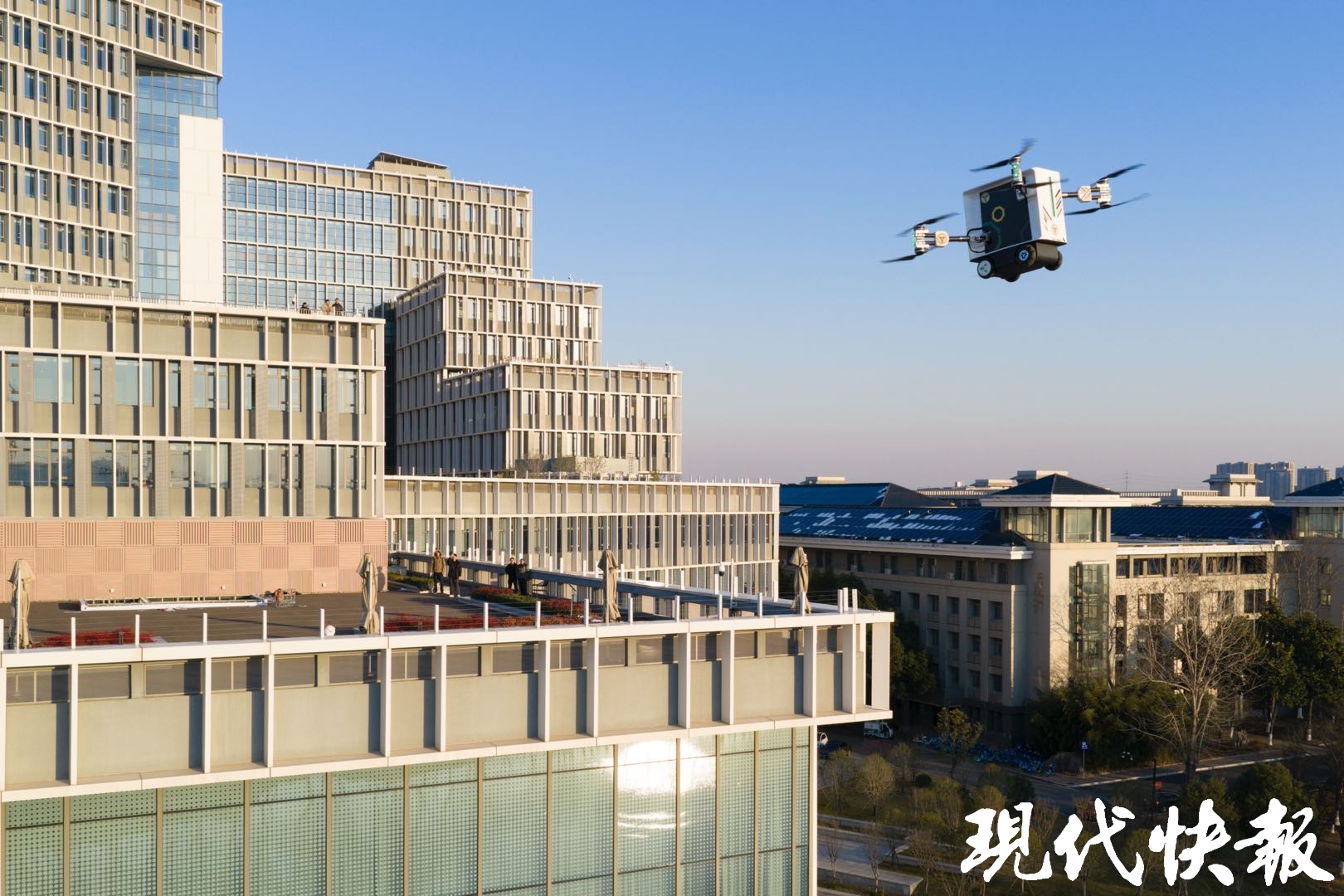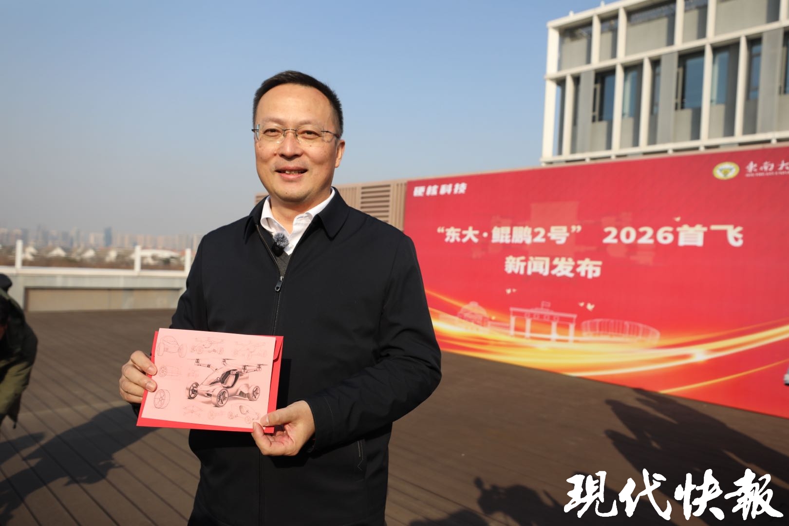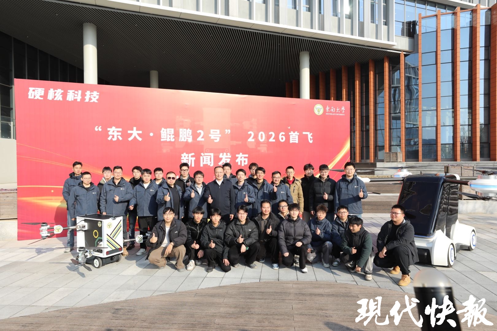 现代快报讯(通讯员 吴涵玉 记者 李楠/文 王玉秋晨/摄)1月23日,东南大学九龙湖校区湖畔,一辆飞行汽车缓缓升空,越过粼粼湖面,不到2分钟,稳稳降落在对岸三江楼五楼的户外平台。这是东南大学汽车科研团队研发的“东大·鲲鹏2号”,不仅更轻便,机臂还可以折叠。打开前就像一个储物箱,打开后则变成了一个可以飞行的储物汽车。
