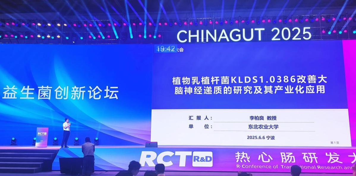 大会首日主论坛迎来重磅时刻——东北农业大学食品学院教授李柏良发布《植物乳植杆菌KLDS1.0386改善大脑神经递质的研究及其产业化应用》主题报告。