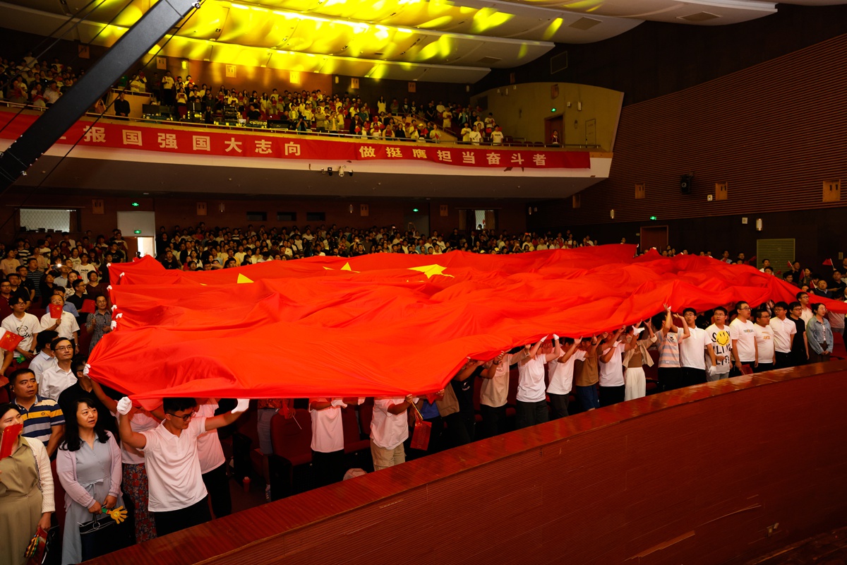 课程最后,全体师生齐声合唱《歌唱祖国》,用歌声祝愿祖国更加繁荣富强。在激扬的歌声中,全场师生共同传递一面巨大的五星红旗,现场渲染成一片红色的海洋……